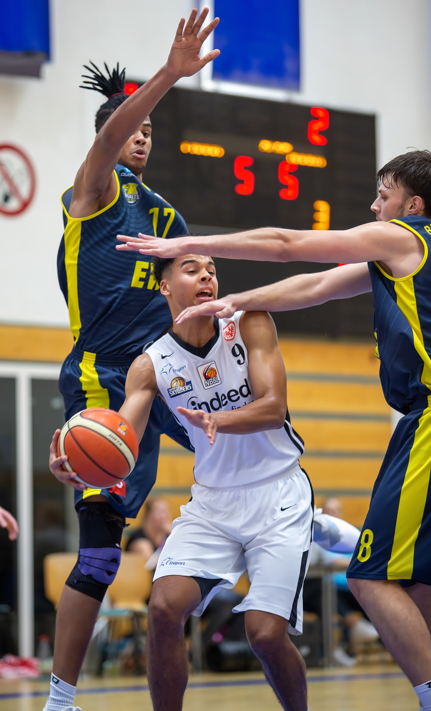 Die NBBL-Mannschaft von Eintracht Frankfurt / FRAPORT SKYLINERS, mit vier Siegen aus den ersten vier Spielen in die Saison gestartet, geht mit Len Schoormann, Maxi Begue, Alvin Onyia, Calvin Schaum und Jordan Samare in das Duell mit dem Tabellendritten Leverkusen. Zu Beginn sehen die Zuschauer, wie beide Mannschaften aggressiv verteidigen und dem Gegner so nur wenige Punkte ermöglichen – 11:9 steht am Ende des ersten Viertels auf der Anzeige. Anschließend kommt das Team von Miran Cumurija in der Offensive immer besser in Schwung, defensiv setzen sie die Gäste weiterhin früh im Spielaufbau unter Druck. So gewinnen sie das zweite Viertel mit 27 zu 9 und erarbeiten sich zur Halbzeitpause einen komfortablen Vorsprung – 38:18.